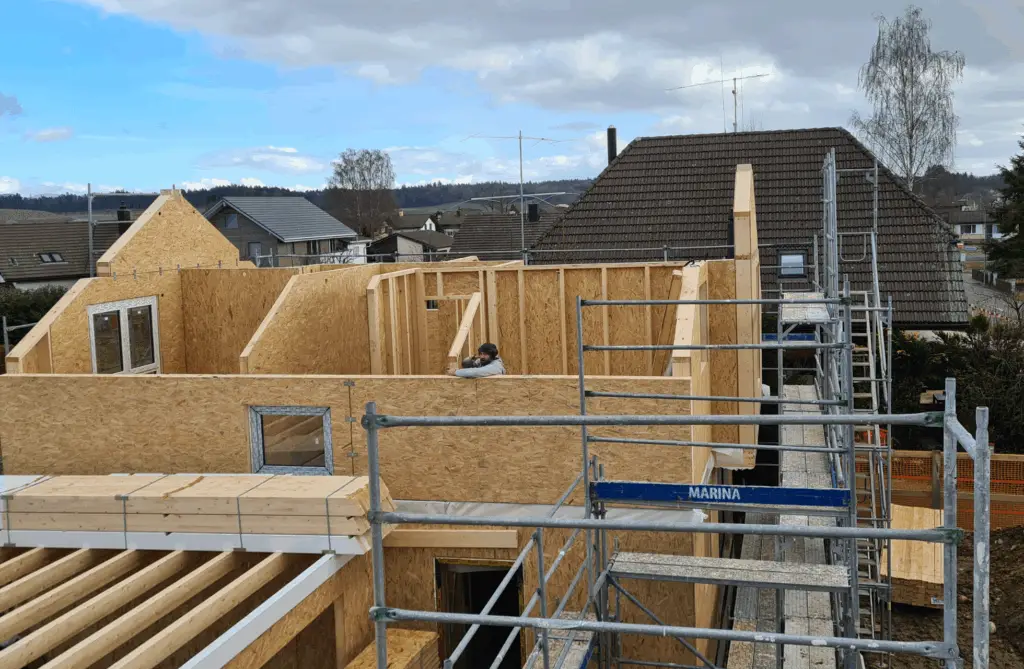 Hier entsteht ein Neubau in moderner Holzrahmenbauweise. UNA Montage hat die vorgefertigten Wand- und Deckenelemente per Kran gesetzt, die Tragstruktur Schritt für Schritt geschlossen und für den Dachaufbau vorbereitet. Durch exakte Vorbereitung, abgestimmte Logistik und saubere Ausführung lief die Montage ohne Leerlauf und Nacharbeiten. Der Rohbau stand in kurzer Zeit – bereit für Fassade, Haustechnik und Innenausbau.