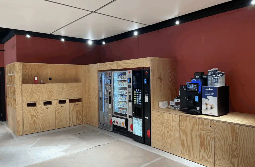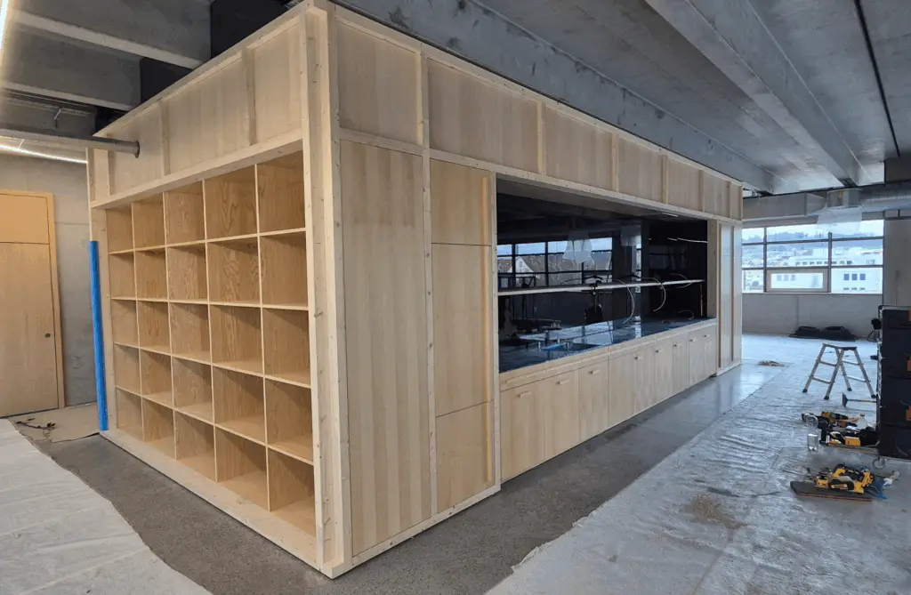 Aus einer Rohfläche entstand eine einladende Aufenthalts- und Versorgungszone mit zentraler Theke, verkleideten Stützen, durchgehenden Stehleisten und einer modularen Rückwand für Automaten und Technik. UNA Montage übernahm den kompletten Ausbau vor Ort – von der passgenauen Vorfertigung bis zur sauberen Montage. Robuste Sperrholzoberflächen, integrierte Steckdosen und Leitungsführung sowie präzise Fugenbilder und fluchtende Anschlüsse sorgen für langlebige Qualität und sofortige Nutzbarkeit im Büroalltag.